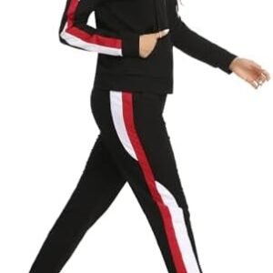 These teenage sweat suits have a jacket and pants, both with side seam pockets. back white patchwork on the jacket and side stripe on the pants are subtle touches that add stylish to this ladies sportswear.