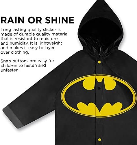 Premium Quality: These Batman rain poncho and umbrella set are made of durable vinyl water-repellent material that is resistant to moisture and humidity. Poncho features an adjustable hood with an elastic band and convenient easy-to-use snap closures. The matching umbrella is made of durable polyester material. it features a safety cap, Batman clamshell handle, velcro strap and nylon cord for easy carrying.