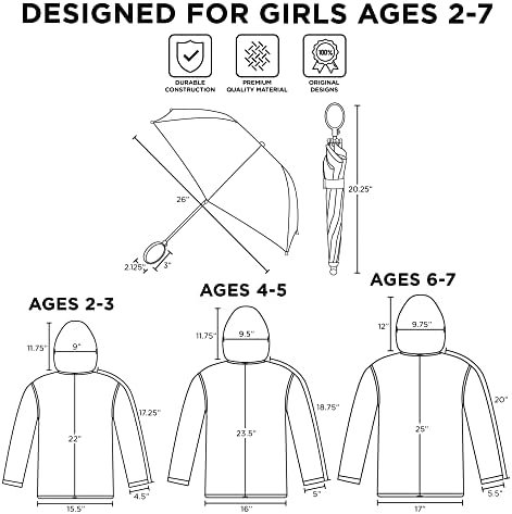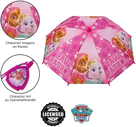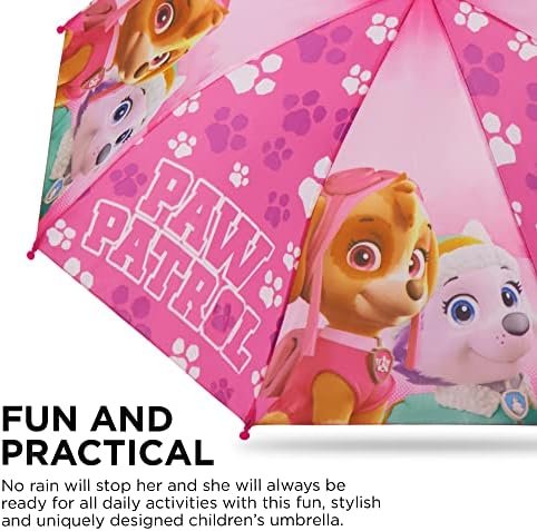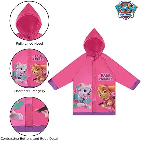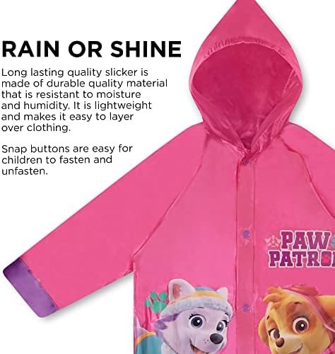 A little rain isn’t going to stop any Paw Patrol fan. Your little girl can join forces with her favorite rescue dogs in this eye-catching 2-piece rainwear set. The adorable rain Slicker and matching Umbrella feature colorful imagery of Skye and Everest from the popular Nickelodeon cartoon. Designed for toddlers and Little Girls and is available in 3 different sizes for girls ages 2-7. The pink rain jackets are moisture and humidity-resistant. Pink snap buttons are easy for children to fasten and unfasten. The thin but durable vinyl slicker fits easily over her clothing to keep her comfy, and an adjustable elastic hood helps keep the rain out. A matching