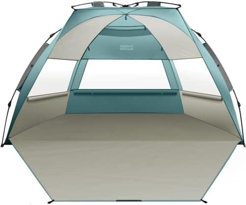 Durable Beach Tent: OutdoorMaster beach tent pop up shade made with durable 150D floor and thick 8.5mm fiberglass poles, also comes with stakes and guy rope to provide more stability