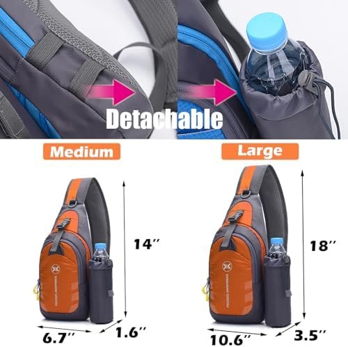 Large size, 10.6 x 3.5 x 18 inches. Features detachable water bottle holder and reversible shoulder strap.