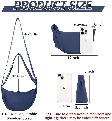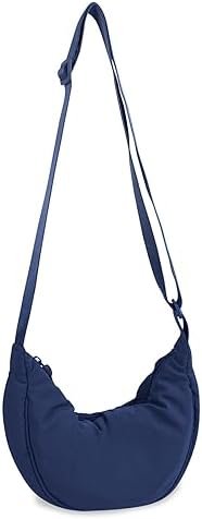 The crescent crossbody bag is made of durable and soft nylon fabric. It is 12” x 3.5” x 6” (L x W x H). The size is small, but it can perfectly accommodate your daily needs such as cell phone, sunscreen, lipstick, keys, umbrella, tissues, etc.The solid-colored crossbody bag has an adjustable shoulder strap and a durable zipper.Whether you are going to work, travel, shopping, dating or to the beach, they are your perfect everyday companion.