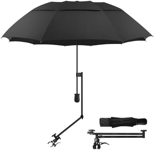 Our golf umbrella is a clamp-on shade canopy that can be carried around and liberate your hands. Whether you are taking a stroller, golf bag, yacht, or wheelchair out to play, resting on beach chairs, courtyards, and tables, or watching your favorite players run on the course, it provides the best sun protection.It is a large golf umbrella .When open, the 43.3″ size canopy spans 50.4inches and the 49.2″ size measures 55 inches. The Golf Cart umbrella stand connector clip can be connected to square and tubular surfaces, and the golf umbrella holder can be tilted at multiple angles to achieve a perfect angle to block out sunlight.