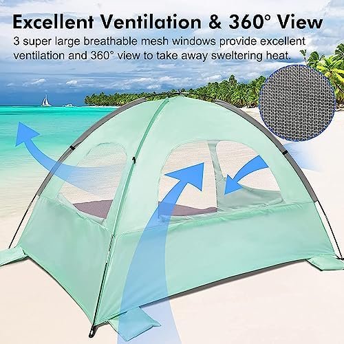 UPF 50+ Protection & Excellent Ventilation: Our beach tent is made of premium 210t sun-proof material coated polyester, it can effectively block heat and 98% of the harmful UV rays. 3 super large roll up mesh windows increase airflow and reduce the temperature. It helps keep summer’s scorching heat away from your family and allows you to enjoy the oceanic breeze with a comfortable space.